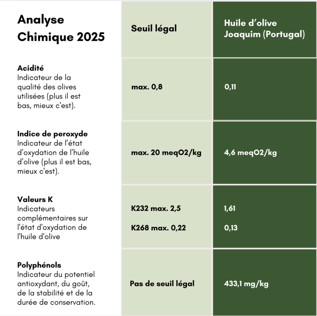 Nos huiles d’olive sont systématiquement analysées chaque année, de façon indépendante du producteur, afin d’évaluer un panel de paramètres de qualité. Par exemple, nous évaluons le fruité, la teneur en polyphénols ou encore le degré d’acidité. Pour nous, ce n’est pas seulement le bon goût d’une huile qui compte, mais aussi de comprendre pourquoi elle est si savoureuse. La connaissance renforce le goût 😉.